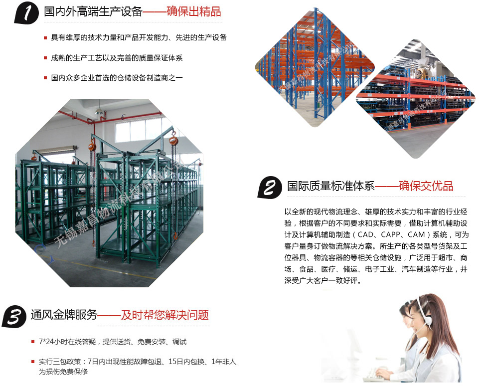 無(wú)錫嘉昌倉(cāng)儲(chǔ)貨架有限公司擁有多年的設(shè)計(jì)、生產(chǎn)、管理經(jīng)驗(yàn)。以全新的現(xiàn)代物流理念、雄厚的技術(shù)實(shí)力和豐富的行業(yè)經(jīng)驗(yàn),根據(jù)客戶的不同要求和實(shí)際需要,借助計(jì)算機(jī)輔助設(shè)計(jì)及計(jì)算機(jī)輔助制造(CAD、CAPP、CAM)系統(tǒng),可為客戶量身訂做物流解決方案。所生產(chǎn)的各類型號(hào)貨架及工位器具、物流容器的等相關(guān)倉(cāng)儲(chǔ)設(shè)施,廣泛用于超市、商場(chǎng)、食品、醫(yī)療、儲(chǔ)運(yùn)、電子工業(yè)、汽車(chē)制造等行業(yè),并深受廣大客戶一致好評(píng)。